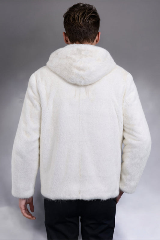 • White Faux Fur Zip-Up Hooded Long Sleeve Men's Winter Coat
