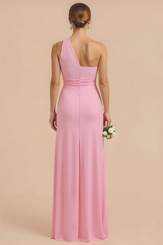 Candy Pink Sheath One Shoulder Long Bridesmaid Dress