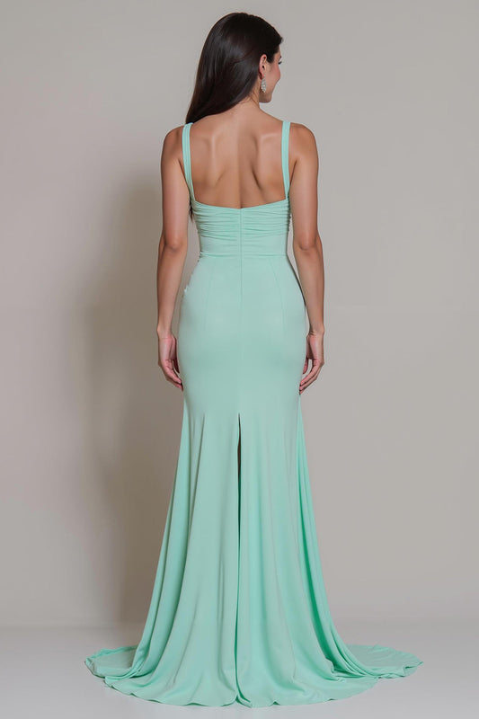 Mint Green Satin Sweetheart Ruched Long Bridesmaid Dress with Slit