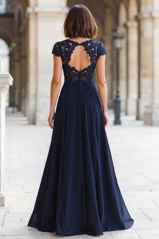 • Navy A-Line Boat Neck Short Sleeves Chiffon Long Mother Of the Bride Dress with Lace Appliques