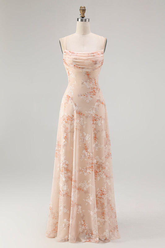 Champagne A Line Cowl Neck Floral Burnout Long Bridesmaid Dress