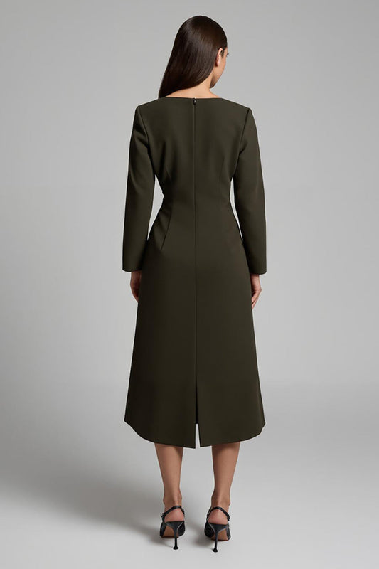 Dark Olive Satin Boat Neck Pencil Midi Work Dress With Sleeves