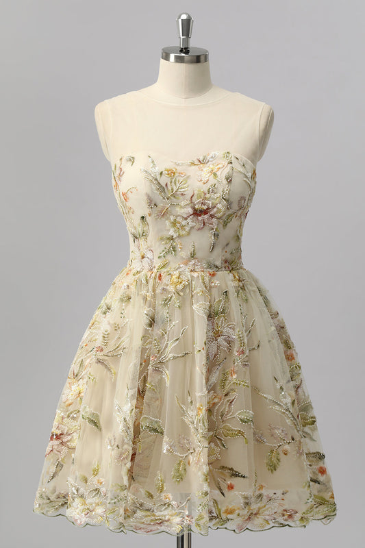 Apricot Floral A Line Illusion Beaded Mini Homecoming Dress