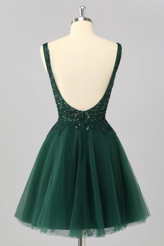 Sparkly Dark Green A Line V-Neck Short Homecoming Dress