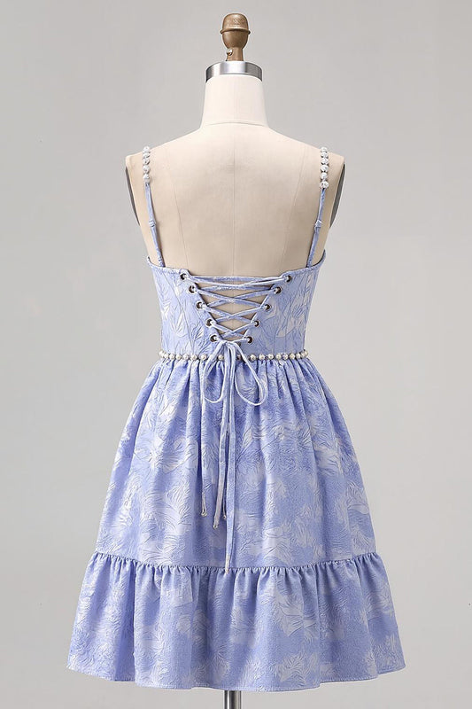 • Blue Spaghetti Straps Brocade Beaded A Line Homecoming Dress