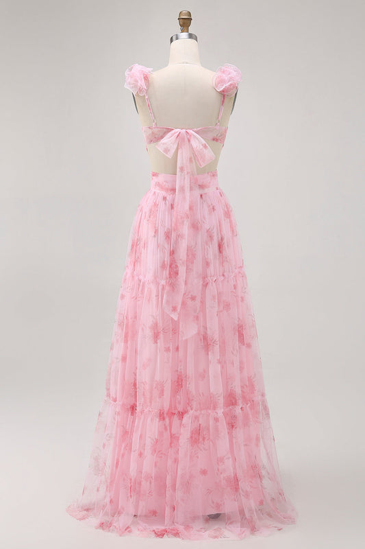• Blush Floral Printed A Line Tulle Long Bridesmaid Dress with Ruffles