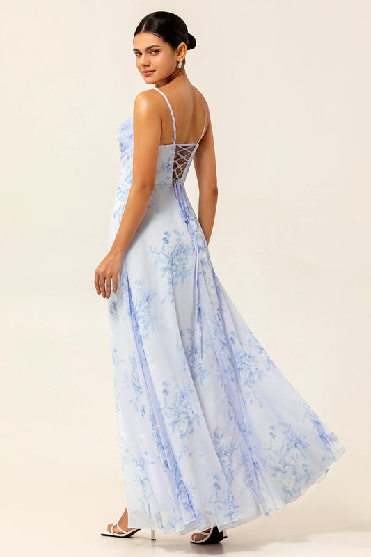 • Blue Floral Spaghetti Straps Corset Fitted Long Bridesmaid Dress with Slit