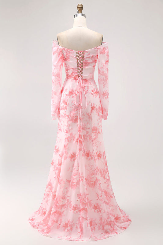 • Pink Flower Mermaid Off The Shoulder Long Sleeve Bridesmaid Dress with Slit