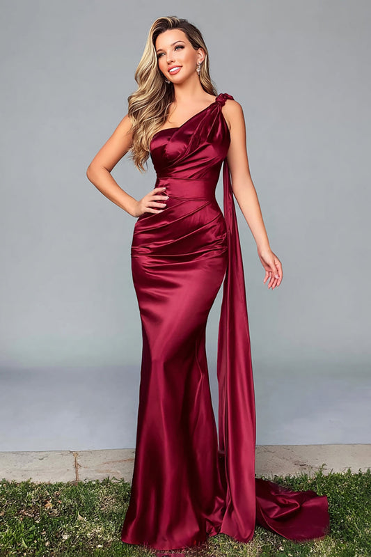 Burgundy Mermaid Ruched One Shoulder Long Formal Dress with Cape