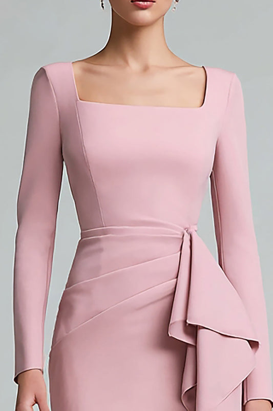 Pink Sheath Ruched Square Neck Midi Work Dress with Drape
