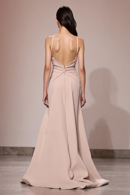 • Champagne Satin Backless Ruched Long Evening Dress With Slit