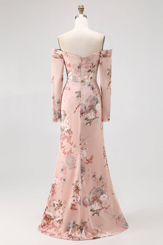 Blush Floral Off The Shoulder Sheath Long Wedding Guest Dress with Slit