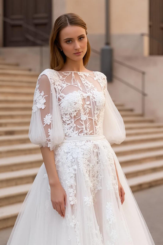 High Neck A Line Tulle Ivory Lace Wedding Dress With Puff Sleeves