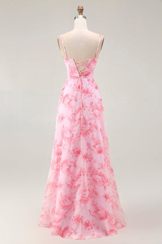 Pink Floral Corset A Line Spaghetti Straps Maxi Dress with Slit