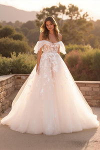 Ivory A Line Off The Shoulder Flutter Sleeve Court Train Wedding Dress With Lace