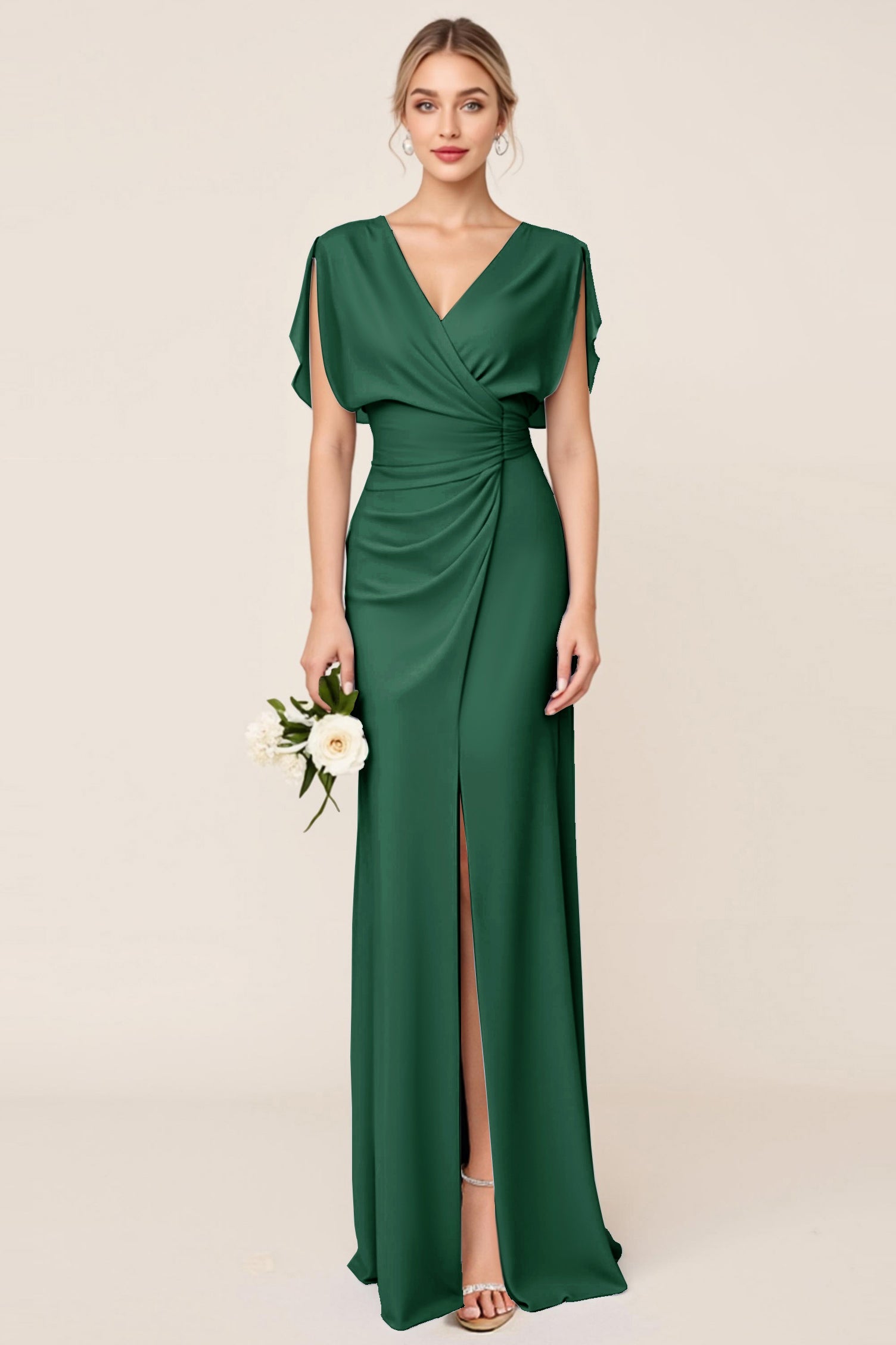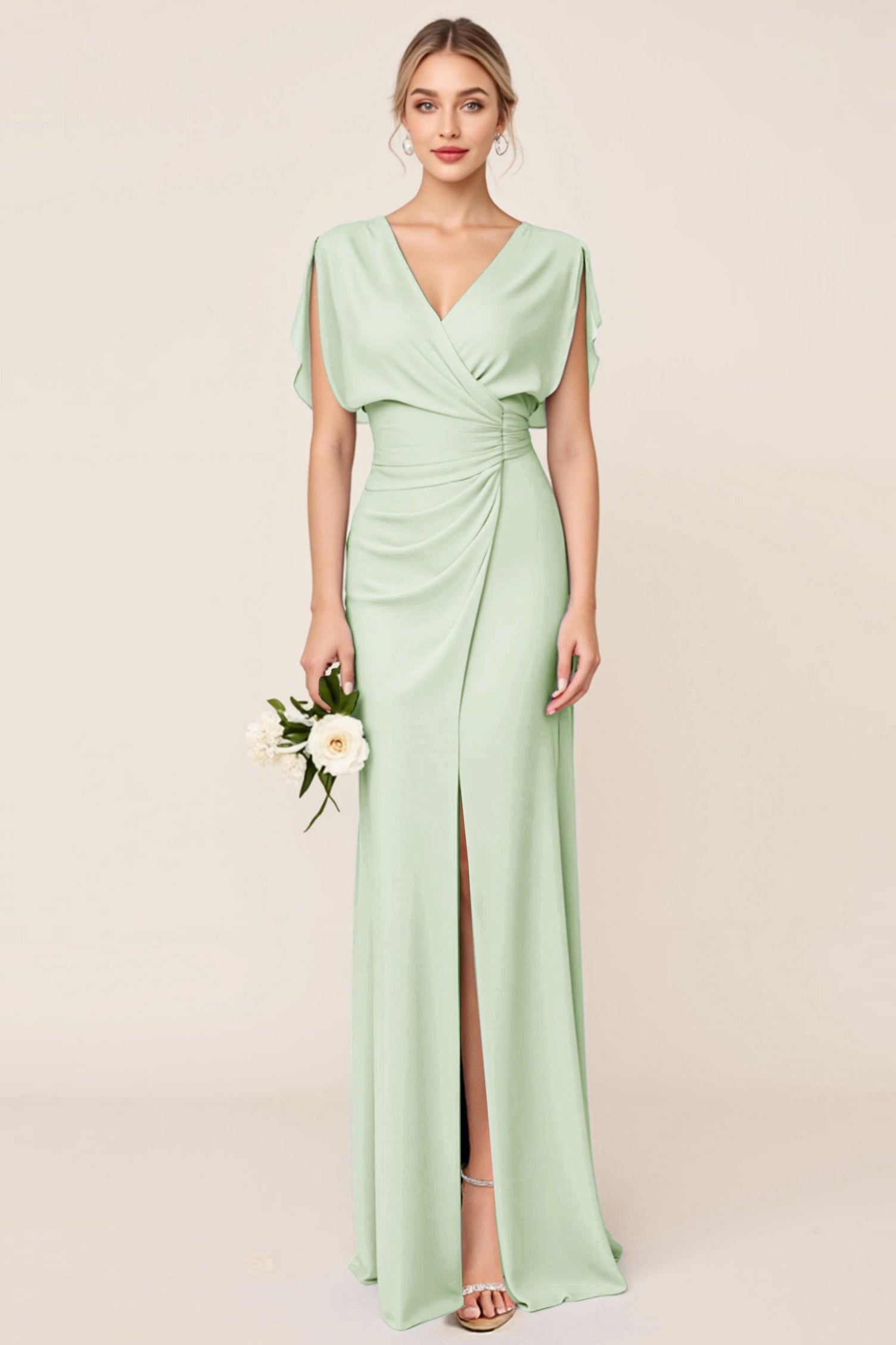 Light Blue Sheath Wrap V Neck Chiffon Long Bridesmaid Dress