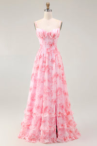 Pink Floral Corset A Line Spaghetti Straps Maxi Dress with Slit
