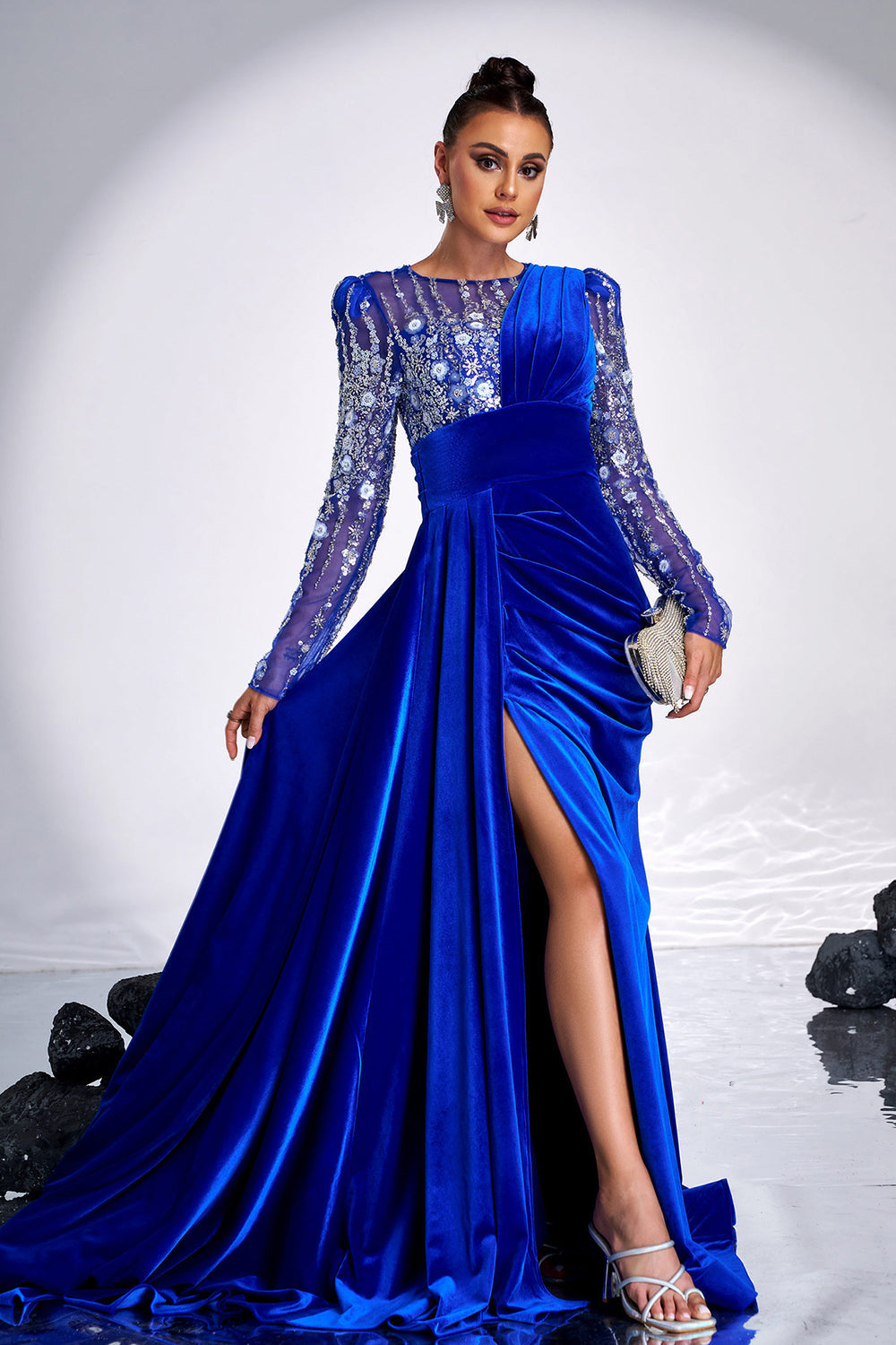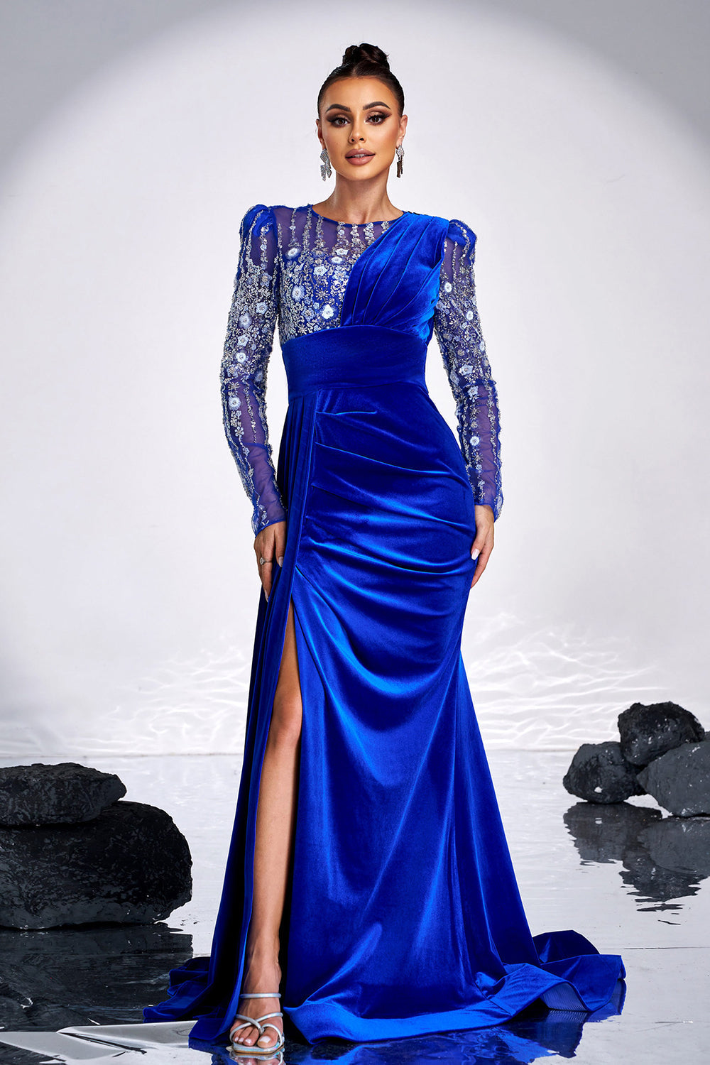 Royal Blue Beaded Mermaid Velvet Prom Dress